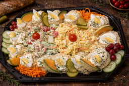 * Huzaren, aardappel en rauwkost salade op schaal* Kruidenboter* Stokbrood* Pindasaus, BBQ-saus en Knoflooksaus